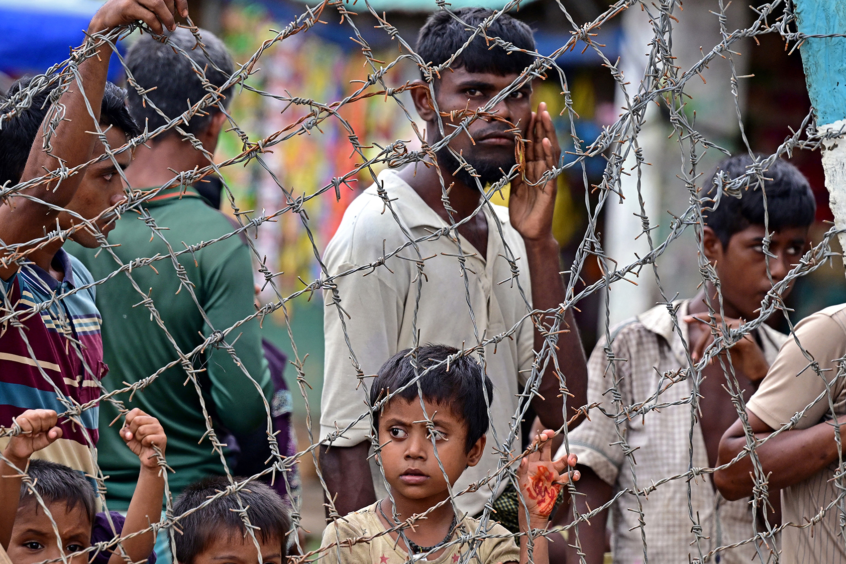 Rohingya refugees stand behind barbed wire at Kutupalong refugee camp in Bangladesh in September last year./ AFP