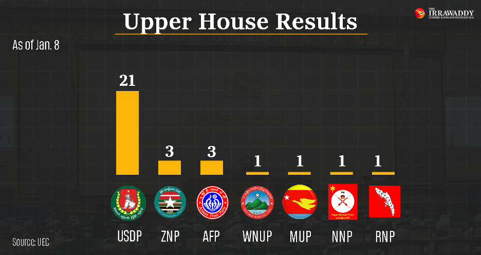 As of Jan. 8, the UEC reported 31 confirmed seats in the Upper House. The USDP won 21, while ethnic parties took the rest: