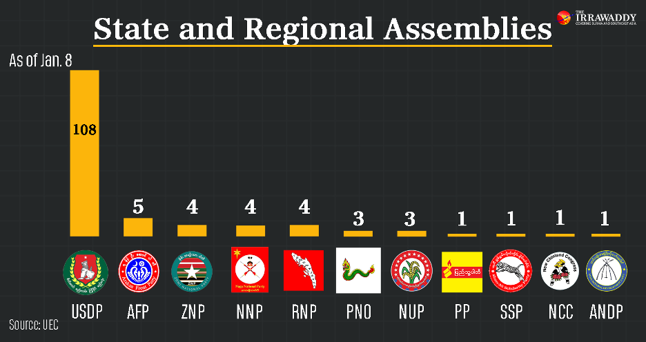 By Jan. 7, the UEC had confirmed 135 seats in state and regional assemblies. The USDP won 108, while ethnic and local parties shared the remainder: