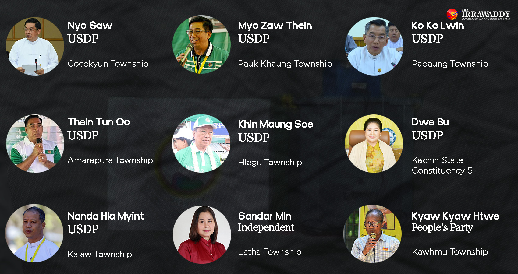 Some prominent figures among non-USDP candidates include Kyaw Kyaw Htwe, aka Ko Marki, and Sandar Min.