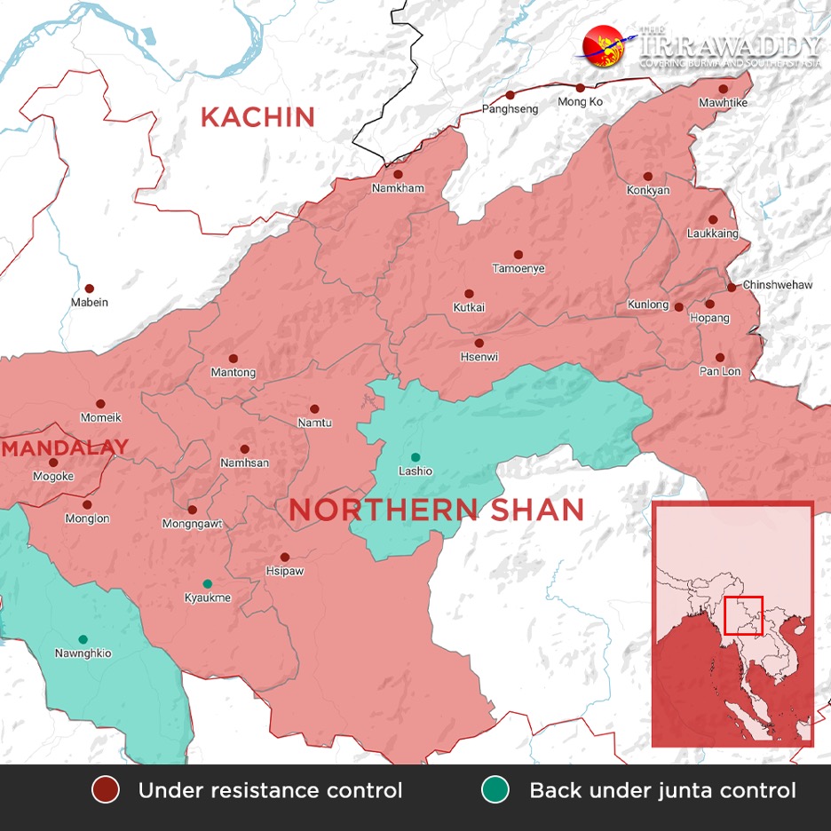 The Ta’ang National Liberation Army (TNLA) captured 12 towns, eleven in Shan and one in Mandalay Region, while the KIA seized one in Mabein Township in northern Shan. Kutkai is divided between MNDAA and TNLA control.