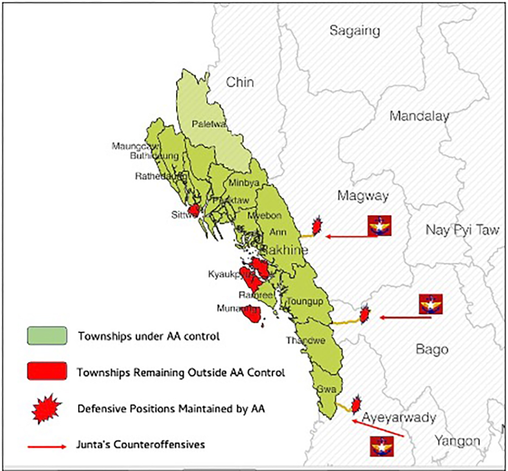 At a press conference, Khaing Thukha reaffirmed that the AA would neither return any captured township to the junta nor permit elections to be held in its controlled areas. To consolidate its hold and deter counteroffensives, the AA has focused on blocking military advances from three strategic corridors: